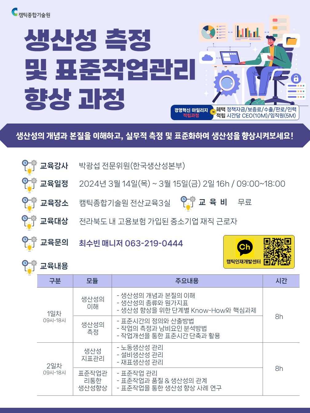 캠틱종합기술원 인재개발팀 전소라 선 임(TEL : 063-219-0425, E-mail : jsr2020@cmtic.or.kr) 캠틱종합기술원 인재개발팀 최수빈 매니저(TEL : 063-219-0444, E-mail : sbchoi@camtic.or.kr)
